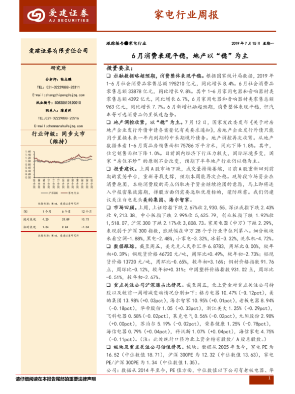 【爱建证券】【20190715】20190715-爱建证券-家电行业周报:6月消费表现平稳,地产以“稳”为主-10页