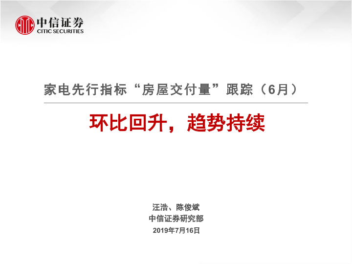 【中信证券】【20190716】家电先行指标“房屋交付量”跟踪(6月):环比回升,趋势持续-9页