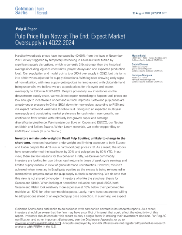 【Goldman Sachs】【20220830】Pulp Price Run Now at The End; Expect Market Oversupply in 4Q22-2024-12页
