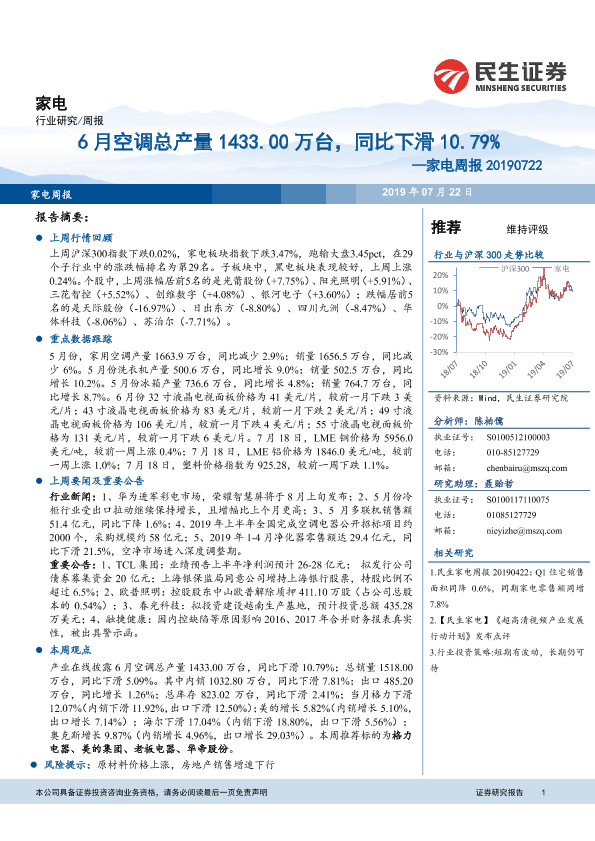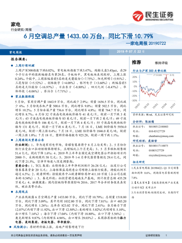 【民生证券】【20190722】20190722-民生证券-家电周报:6月空调总产量1433.00万台,同比下滑10.79%-14页