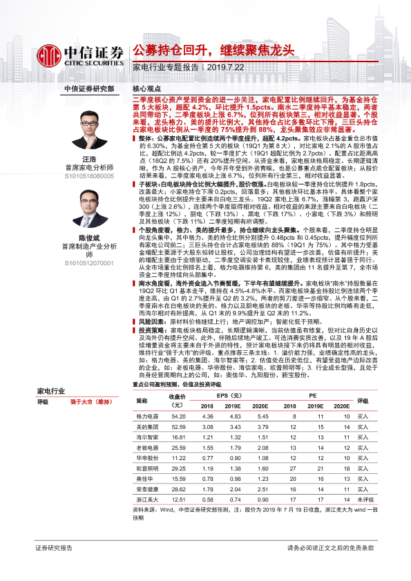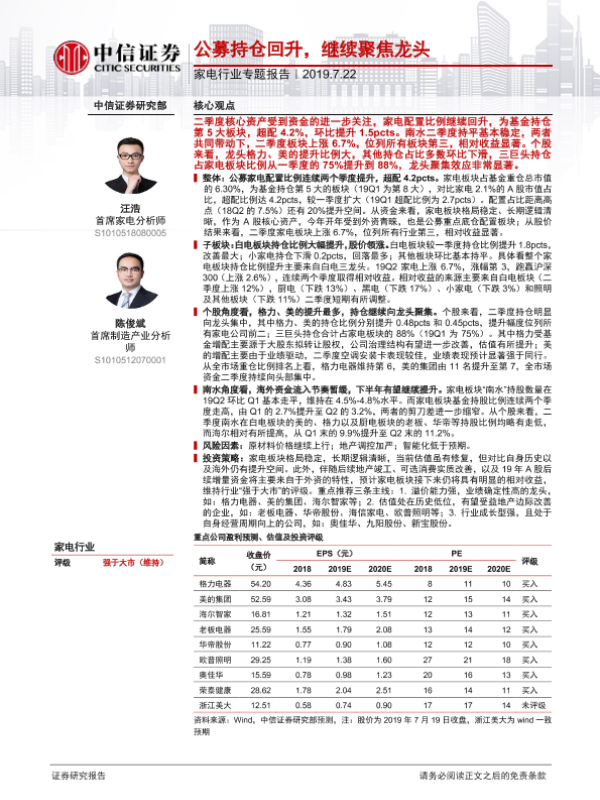 【中信证券】【20190722】家电行业专题报告:公募持仓回升,继续聚焦龙头-11页