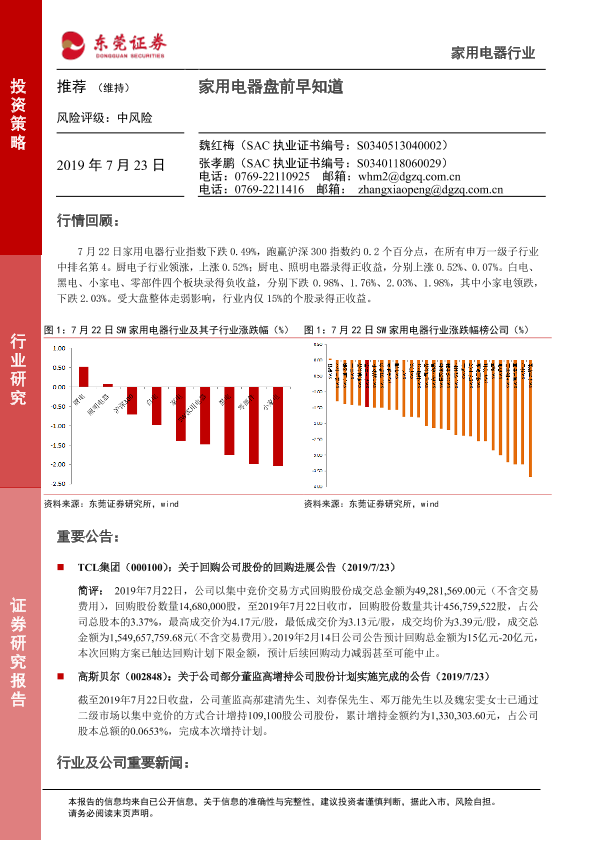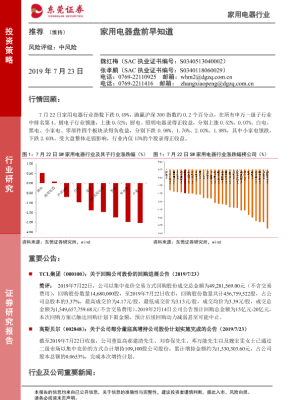 【东莞证券】【20190723】家用电器行业投资策略:家用电器盘前早知道-3页