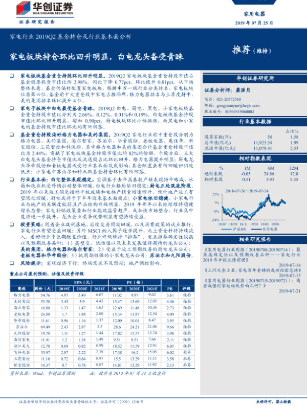 【华创证券】【20190725】家电行业2019Q2基金持仓及行业基本面分析:家电板块持仓环比回升明显,白电龙头备受青睐-20页