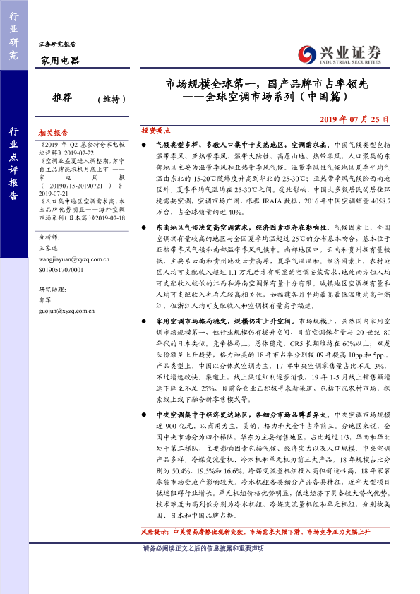 【兴业证券】【20190725】全球空调市场系列(中国篇):市场规模全球第一,国产品牌市占率领先-14页