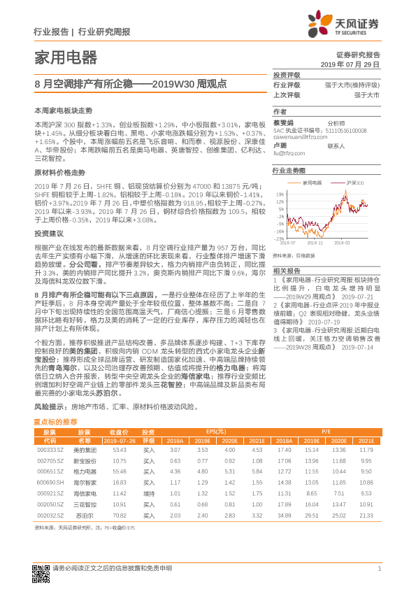 【天风证券】【20190729】家用电器行业研究周报:8月空调排产有所企稳-10页