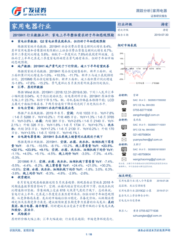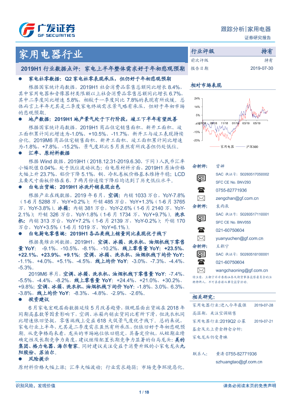 【广发证券】【20190730】家用电器行业2019H1行业数据点评:家电上半年整体需求好于年初悲观预期-18页