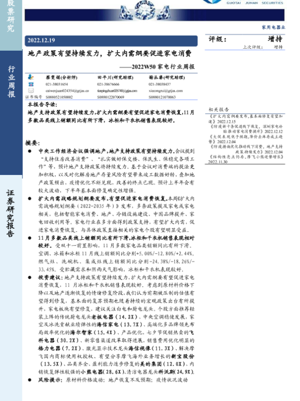 【国泰君安证券】【20221219】2022W50家电行业周报:地产政策有望持续发力,扩大内需纲要促进家电消费-15页