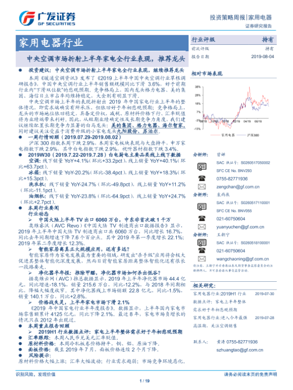【广发证券】【20190804】家用电器行业投资策略周报:中央空调市场折射上半年家电全行业表现,推荐龙头-19页