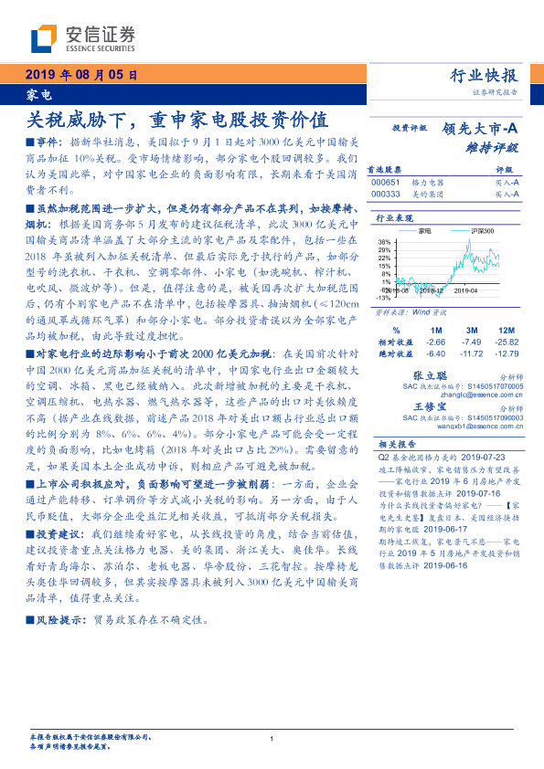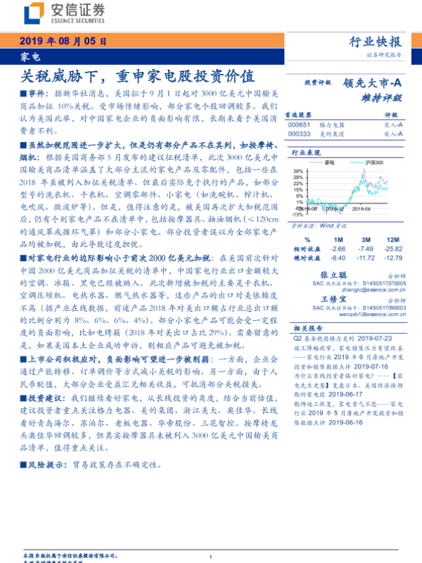 【安信证券】【20190805】家电行业快报:关税威胁下,重申家电股投资价值-3页
