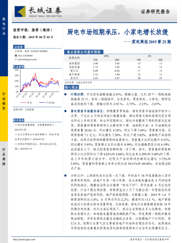 【长城证券】【20190805】家电周报2019第25期:厨电市场短期承压,小家电增长放缓-11页