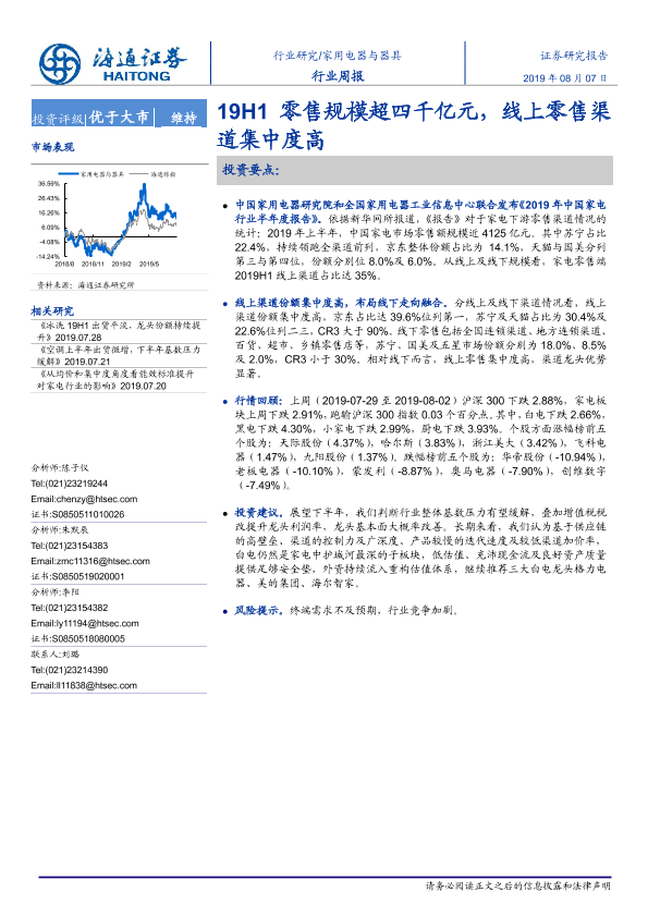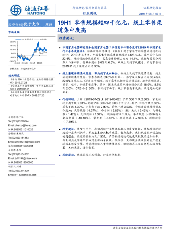 【海通证券】【20190807】20190807-海通证券-家用电器与器具行业周报:19H1零售规模超四千亿元,线上零售渠道集中度高-9页