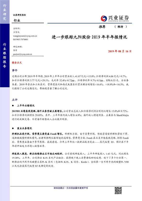 【兴业证券】【20190816】进一步跟踪九阳股份2019年半年报情况-4页
