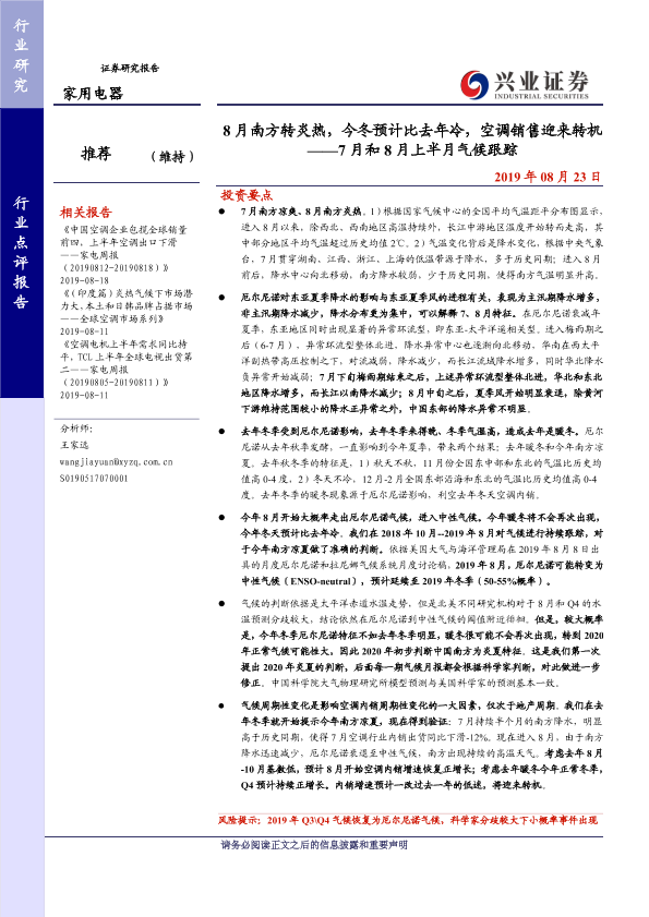 【兴业证券】【20190823】8月南方转炎热,今冬预计比去年冷,空调销售迎来转机 ——7月和8月上半月气候跟踪-8页