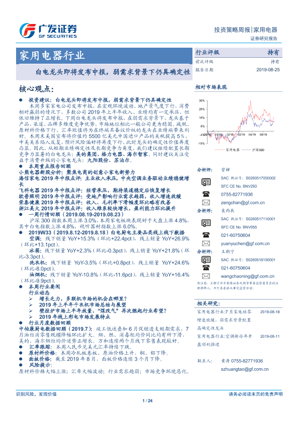 【广发证券】【20190825】家用电器行业:白电龙头即将发布中报,弱需求背景下仍具确定性-24页