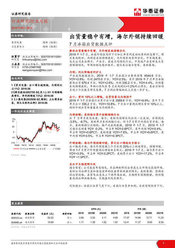 【华泰证券】【20190828】20190828-华泰证券-7月冰箱出货数据点评:出货量稳中有增,海尔外销持续回暖-6页