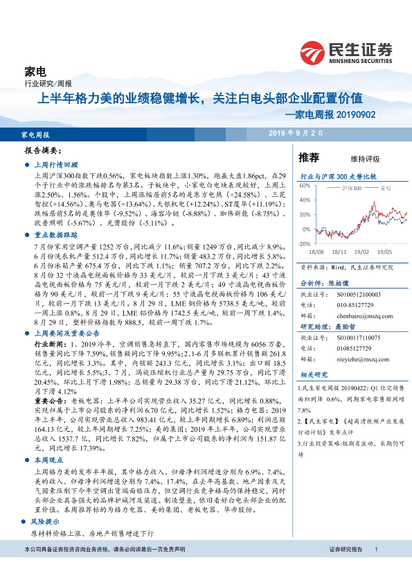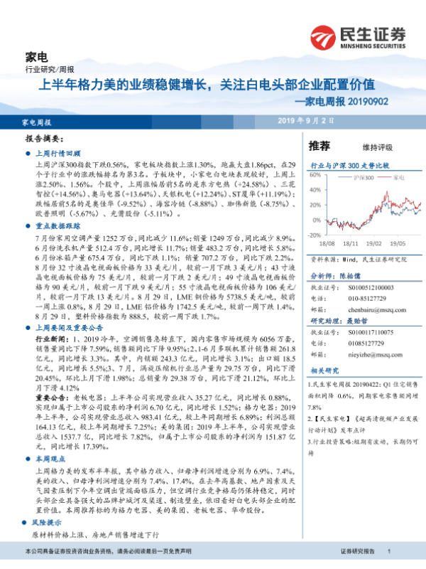 【民生证券】【20190902】20190902-民生证券-家电周报:上半年格力美的业绩稳健增长,关注白电头部企业配置价值-15页