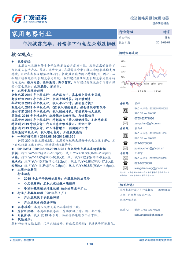 【广发证券】【20190901】20190901-广发证券-家用电器行业投资策略周报:中报披露完毕,弱需求下白电龙头彰显韧性-30页