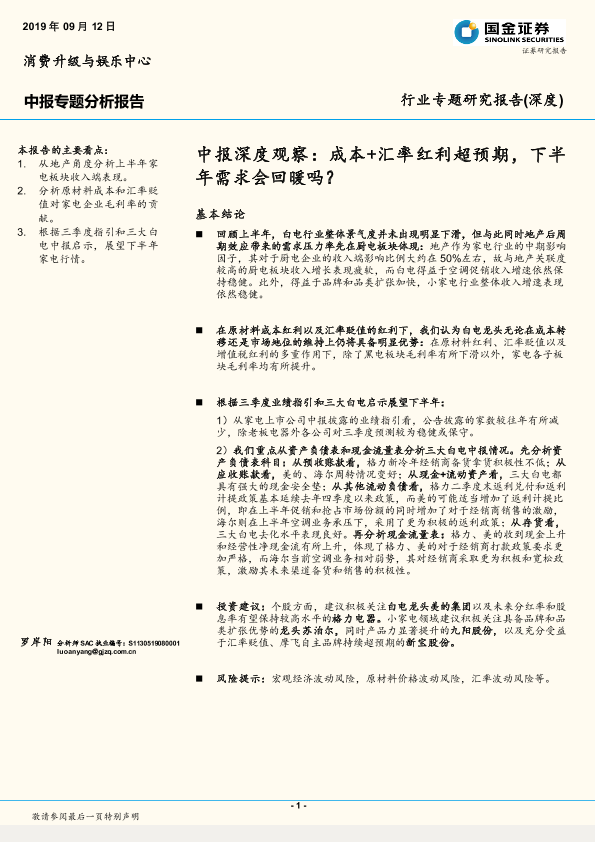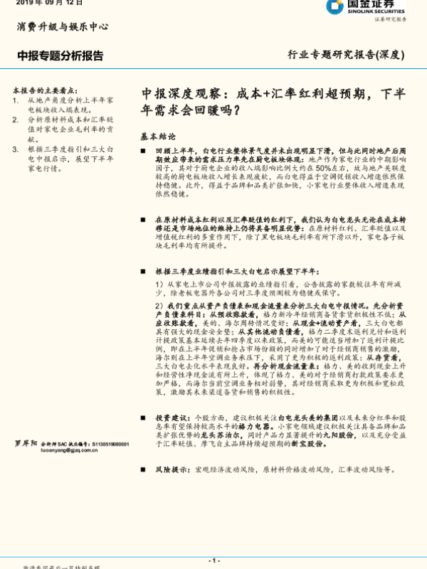 【国金证券】【20190912】消费升级与娱乐中心中报深度观察:成本+汇率红利超预期,下半年需求会回暖吗?-17页