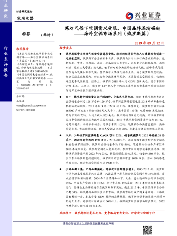 【兴业证券】【20190912】寒冷气候下空调需求受限,中国品牌逐渐崛起 ——海外空调市场系列(俄罗斯篇)-14页