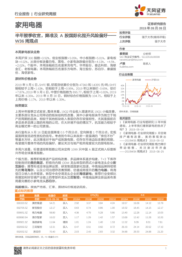 【天风证券】【20190909】家用电器W36周观点:半年报季收官,降准及A股国际化提升风险偏好-10页