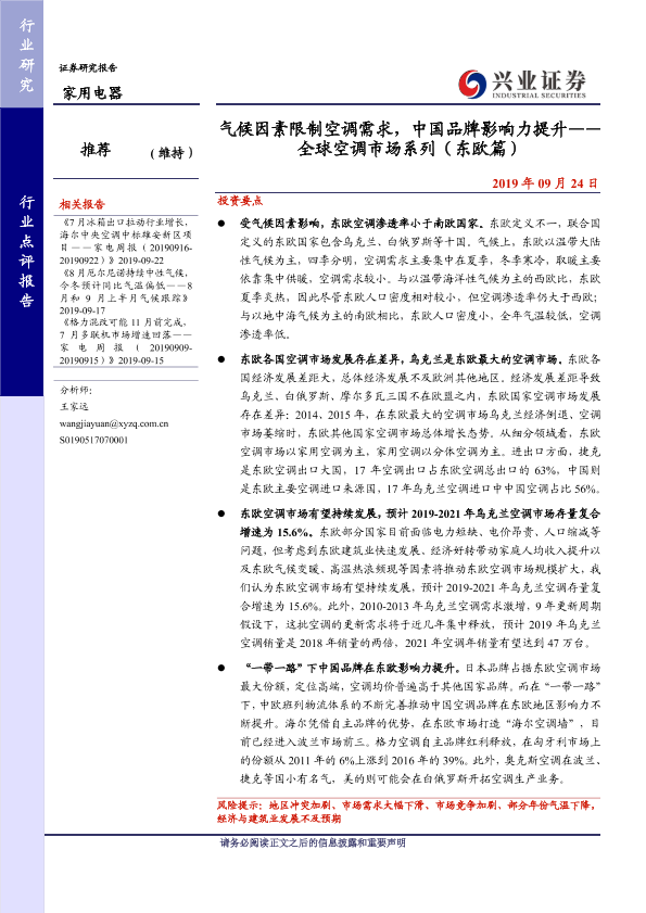 【兴业证券】【20190924】气候因素限制空调需求,中国品牌影响力提升——全球空调市场系列(东欧篇)-16页
