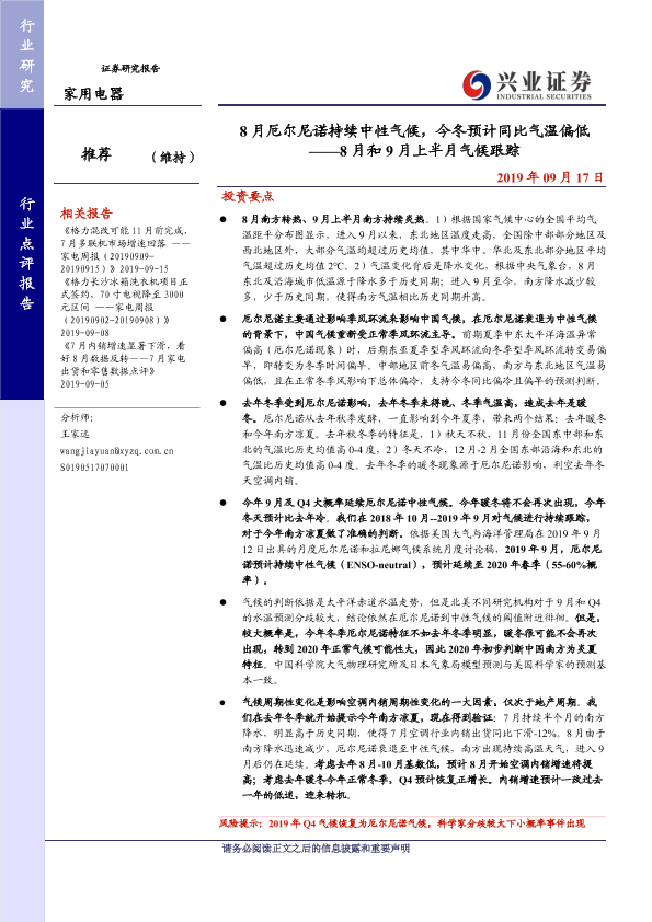 【兴业证券】【20190917】8月厄尔尼诺持续中性气候,今冬预计同比气温偏低 ——8月和9月上半月气候跟踪-9页