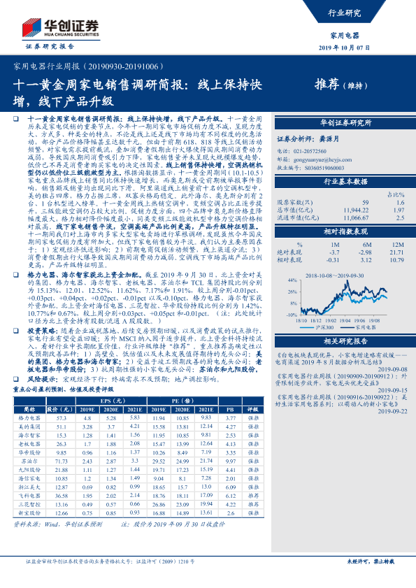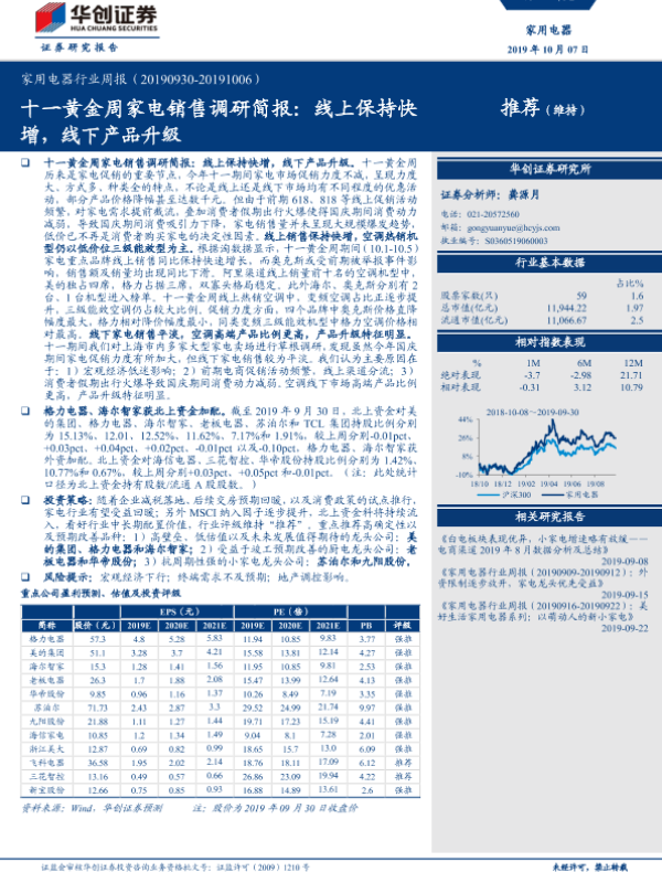 【华创证券】【20191007】家用电器行业周报:十一黄金周家电销售调研简报:线上保持快增,线下产品升级-13页