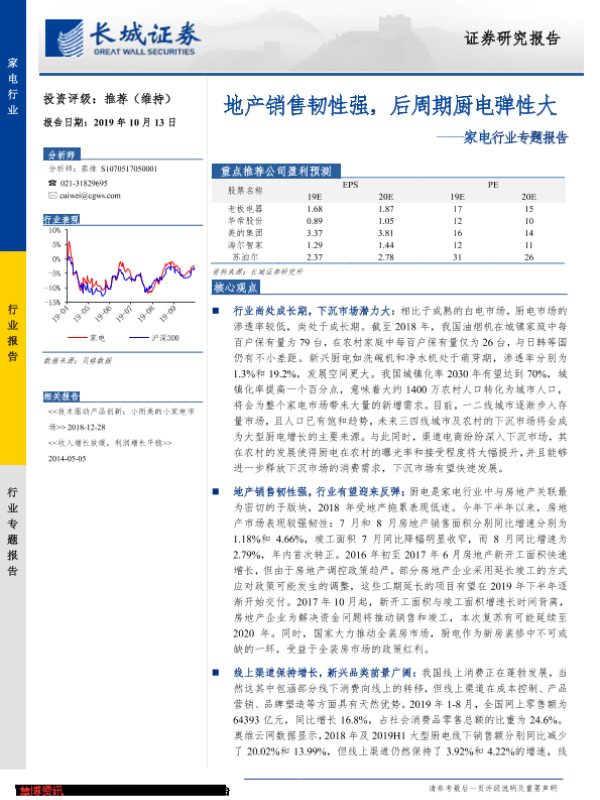 【长城证券】【20191013】家电行业专题报告:地产销售韧性强,后周期厨电弹性大-24页