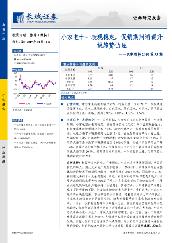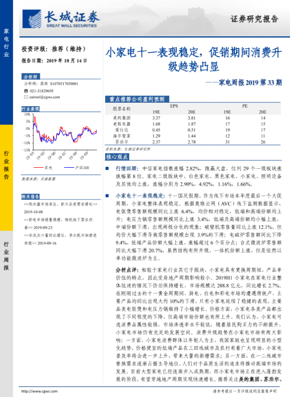【长城证券】【20191014】家电周报2019第33期:小家电十一表现稳定,促销期间消费升级趋势凸显-11页