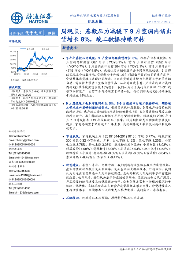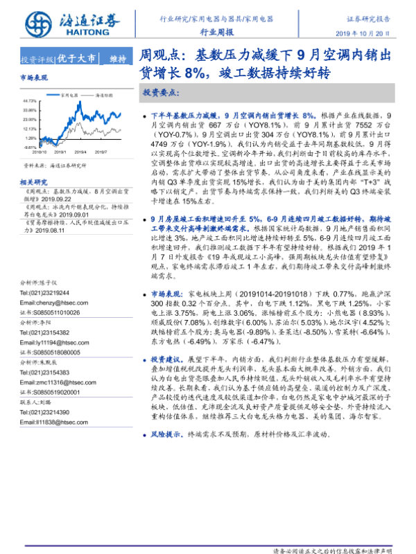 【海通证券】【20191020】20191020-海通证券-家用电器行业周报:周观点:基数压力减缓下9月空调内销出货增长8%,竣工数据持续好转-2页