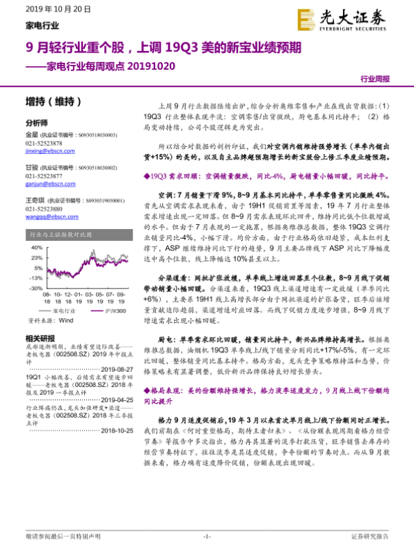 【光大证券】【20191020】家电行业每周观点:9月轻行业重个股,上调19Q3美的新宝业绩预期-9页