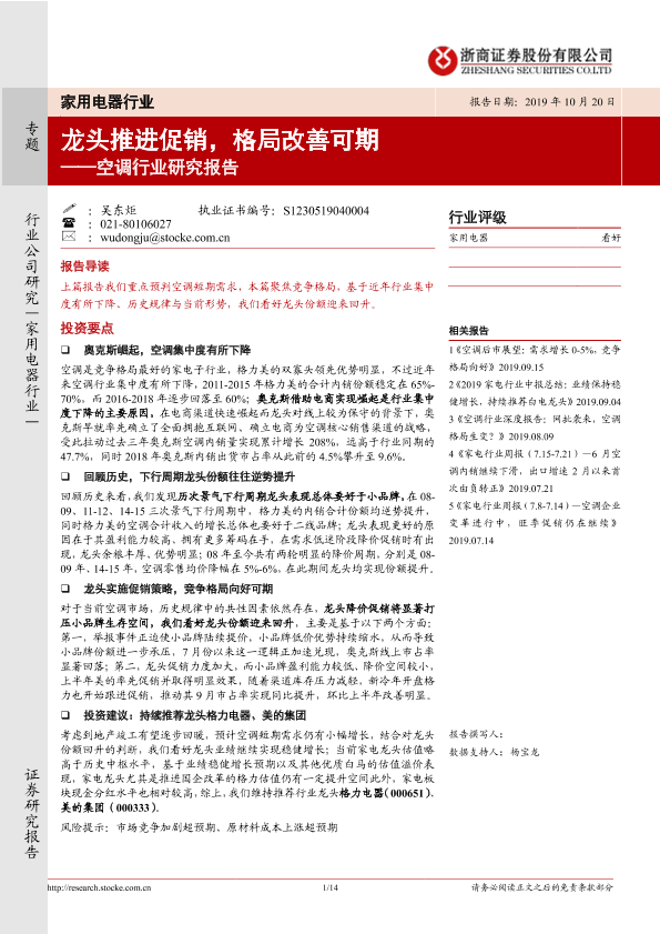 【浙商证券】【20191020】龙头推进促销,格局改善可期——空调行业研究报告-14页