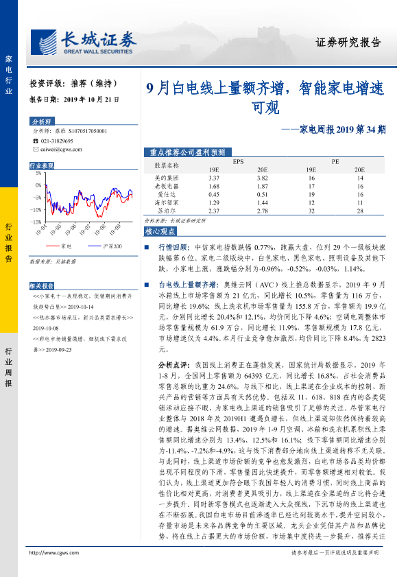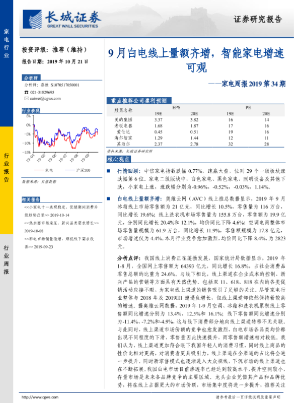 【长城证券】【20191021】家电周报2019第34期:9月白电线上量额齐增,智能家电增速可观-11页