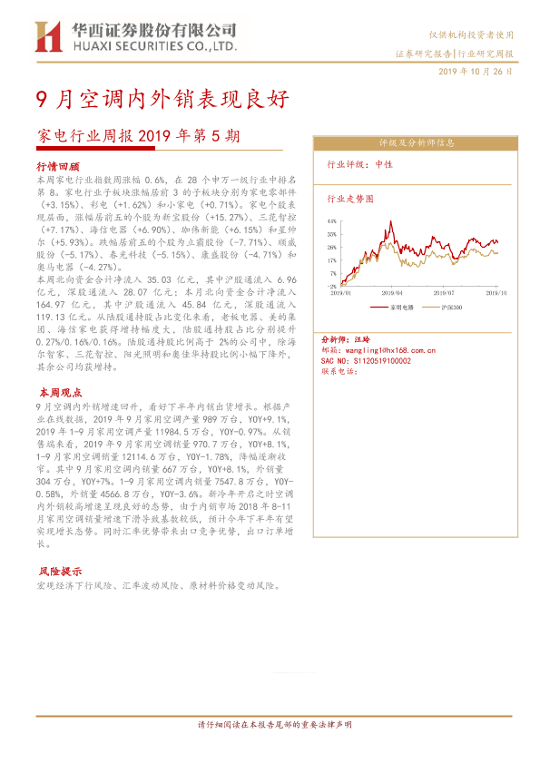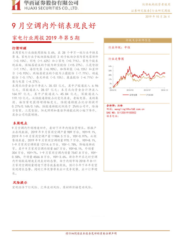 【华西证券】【20191026】家电行业周报2019年第5期:9月空调内外销表现良好-20页