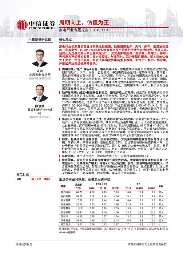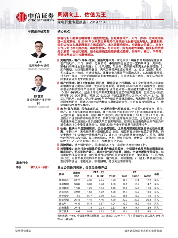 【中信证券】【20191104】家电行业专题报告:周期向上,估值为王-13页