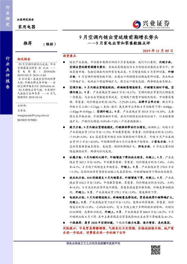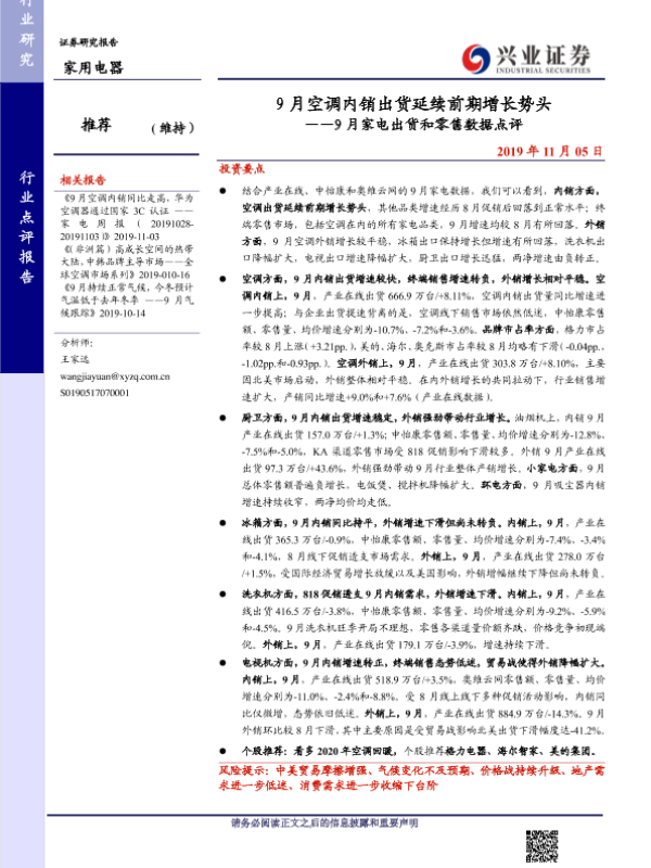 【兴业证券】【20191105】9月空调内销出货延续前期增长势头——9月家电出货和零售数据点评-15页