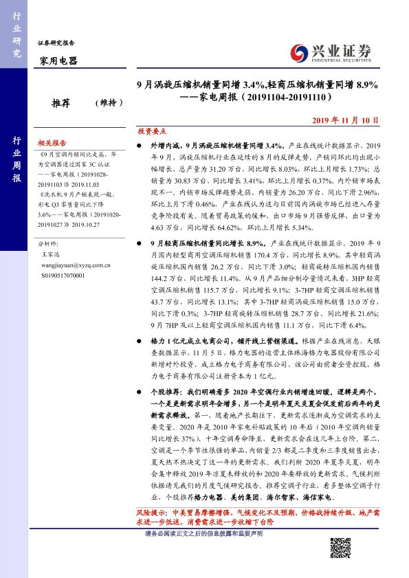 【兴业证券】【20191110】9月涡旋压缩机销量同增3.4%,轻商压缩机销量同增8.9%——家电周报(20191104-20191110)-10页