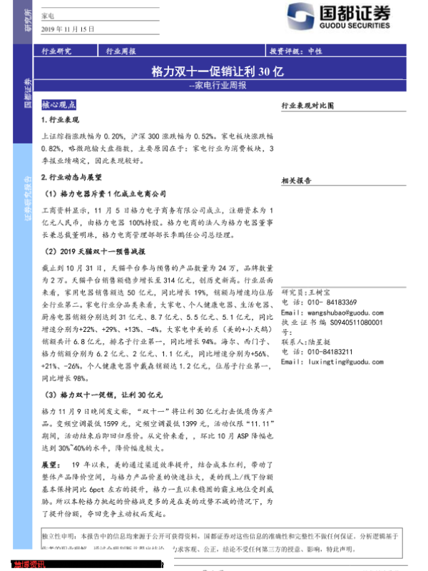 【国都证券】【20191115】家电行业周报:格力双十一促销让利30亿-3页