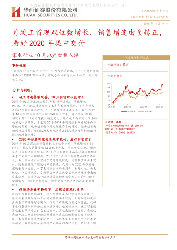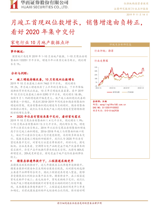 【华西证券】【20191114】家电行业10月地产数据点评:月竣工首现双位数增长,销售增速由负转正,看好2020年集中交付-4页
