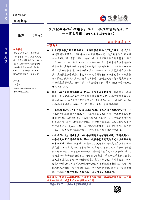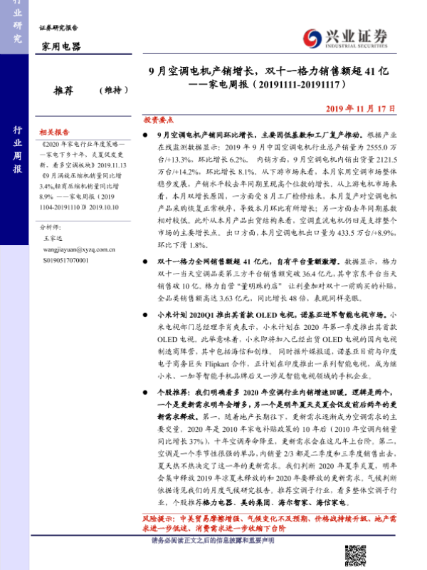 【兴业证券】【20191117】9月空调电机产销增长,双十一格力销售额超41亿-10页