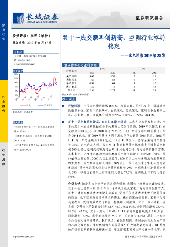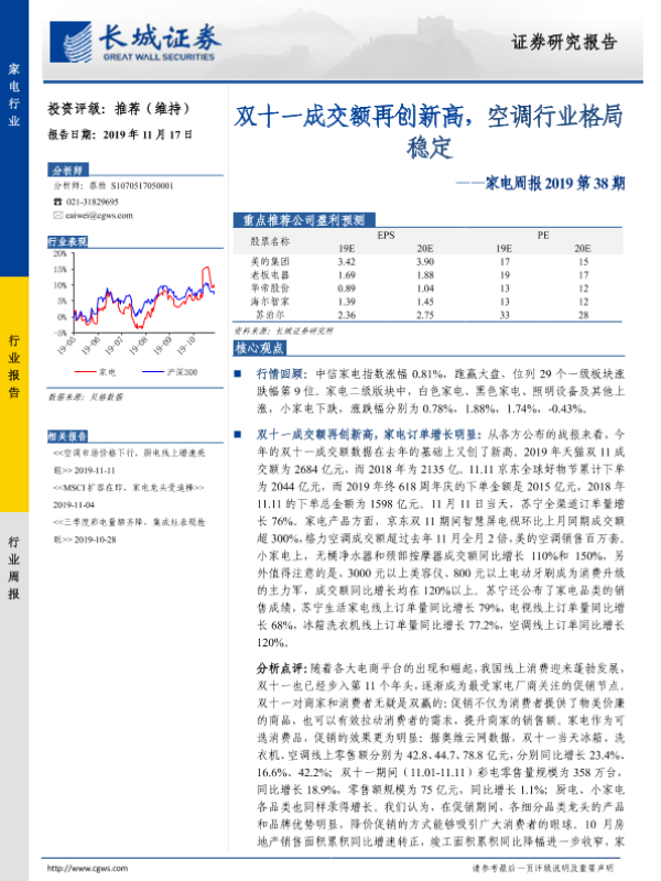 【长城证券】【20191117】家电周报2019第38期:双十一成交额再创新高,空调行业格局稳定-11页