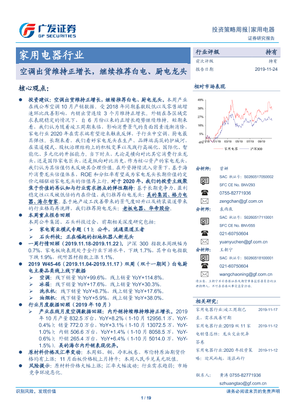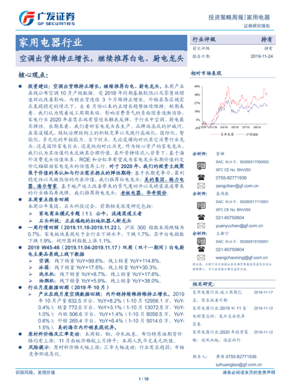 【广发证券】【20191124】家用电器行业投资策略周报:空调出货维持正增长,继续推荐白电、厨电龙头-19页