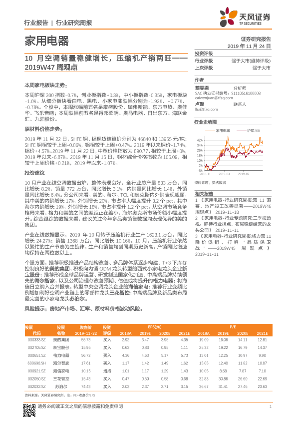 【天风证券】【20191124】家用电器2019W47周观点:10月空调销量稳健增长,压缩机产销两旺-12页