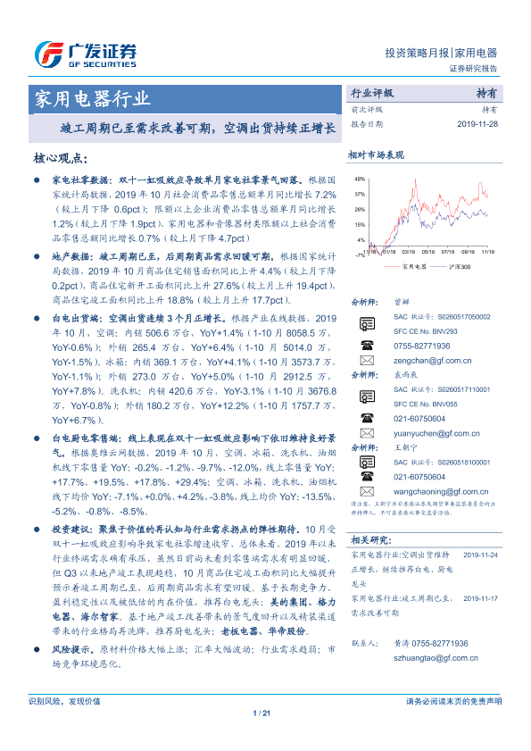 【广发证券】【20191128】家用电器行业投资策略月报:竣工周期已至需求改善可期,空调出货持续正增长-21页