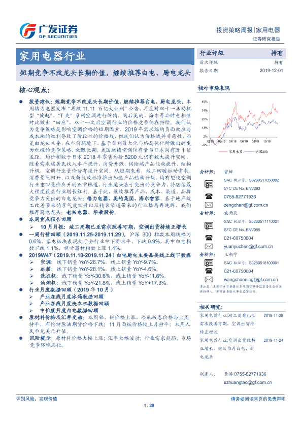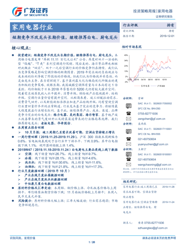 【广发证券】【20191201】20191201-广发证券-家用电器行业投资策略周报:短期竞争不改龙头长期价值,继续推荐白电、厨电龙头-26页