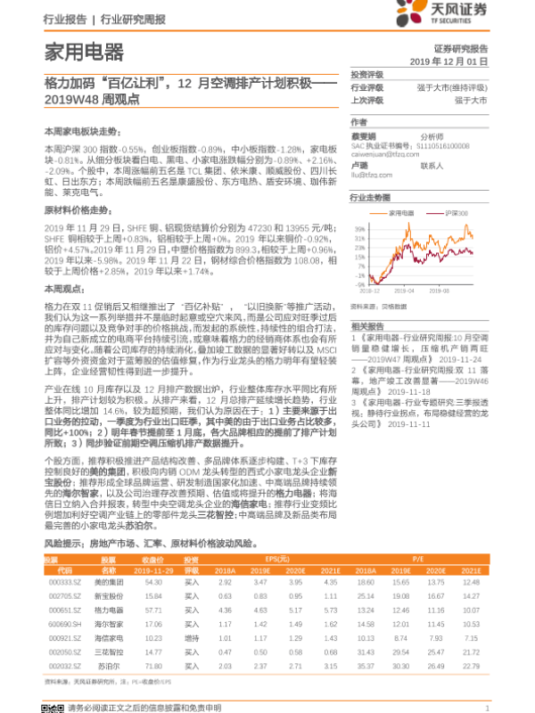 【天风证券】【20191201】家用电器2019W48周观点:格力加码“百亿让利”,12月空调排产计划积极-15页