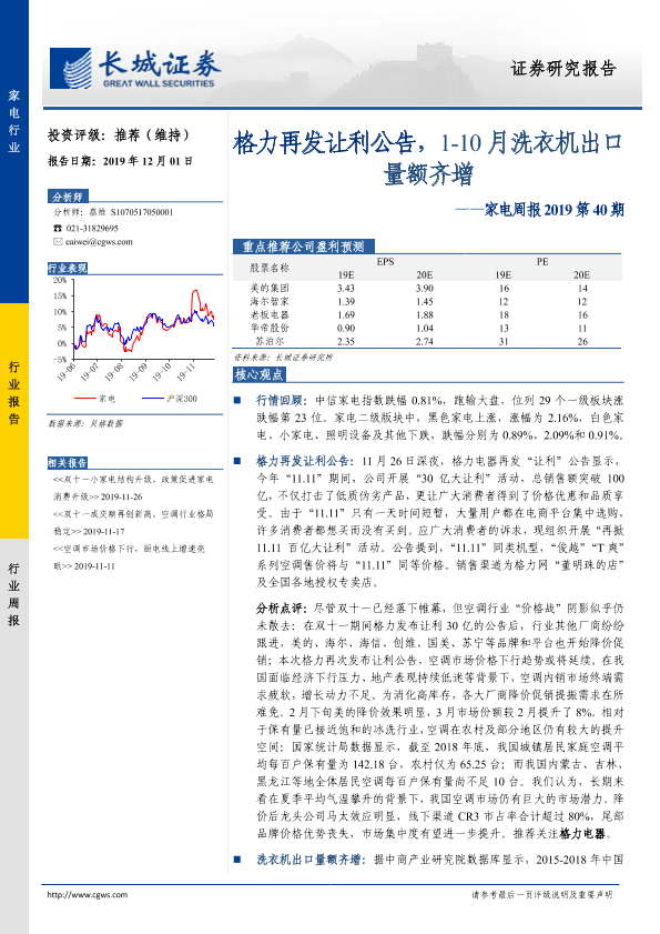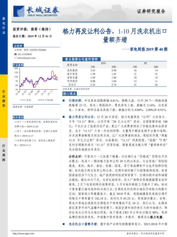 【长城证券】【20191201】家电周报2019第40期:格力再发让利公告,1-10月洗衣机出口量额齐增-11页