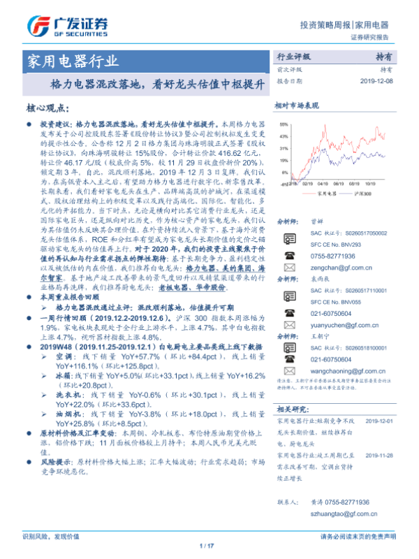 【广发证券】【20191208】家用电器行业投资策略周报:格力电器混改落地,看好龙头估值中枢提升-17页
