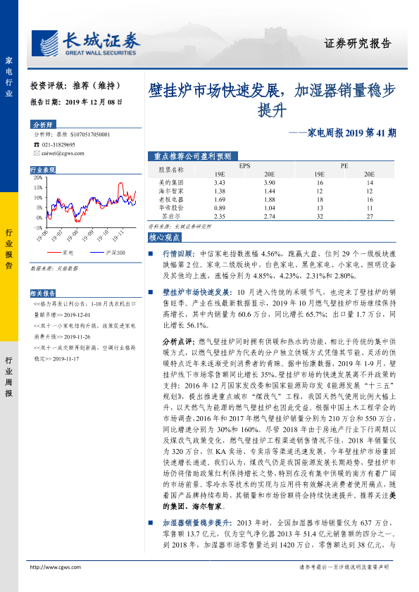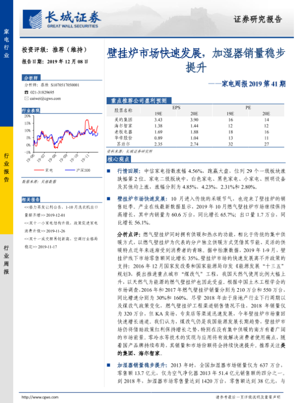 【长城证券】【20191208】家电周报2019第41期:壁挂炉市场快速发展,加湿器销量稳步提升-11页