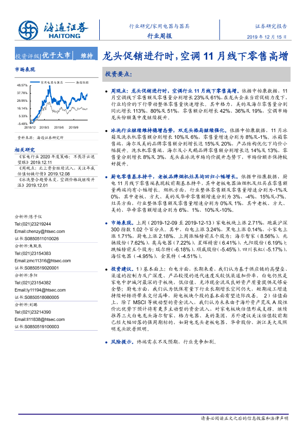 【海通证券】【20191215】家用电器与器具行业周报:龙头促销进行时,空调11月线下零售高增-7页